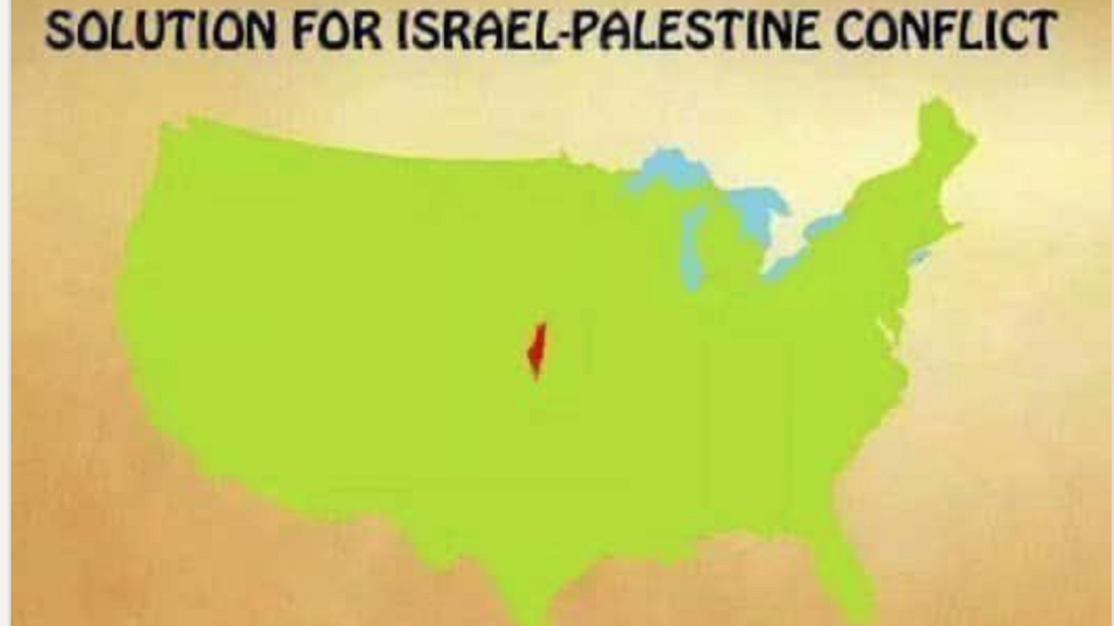 Rubina Halim, a Barnardo’s teacher, shared an image on Facebook that situates Israel in the middle of the United States and calls for the relocation of Israel to America. She added the comment: “The perfect solution to the Israel-Palestine conflict.”