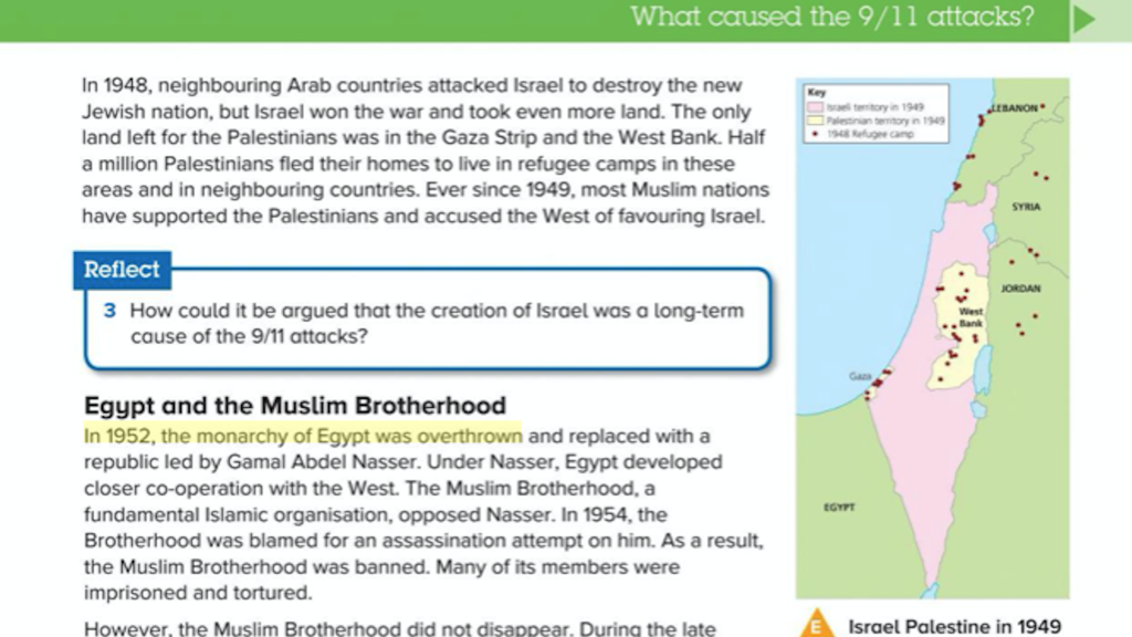 A school textbook has been removed from sale after research revealed that it included the question: “How could it be argued that the creation of Israel was a long-term cause of the 9/11 attacks?” It is understood that this is the only time Israel is mentioned in the entire book.