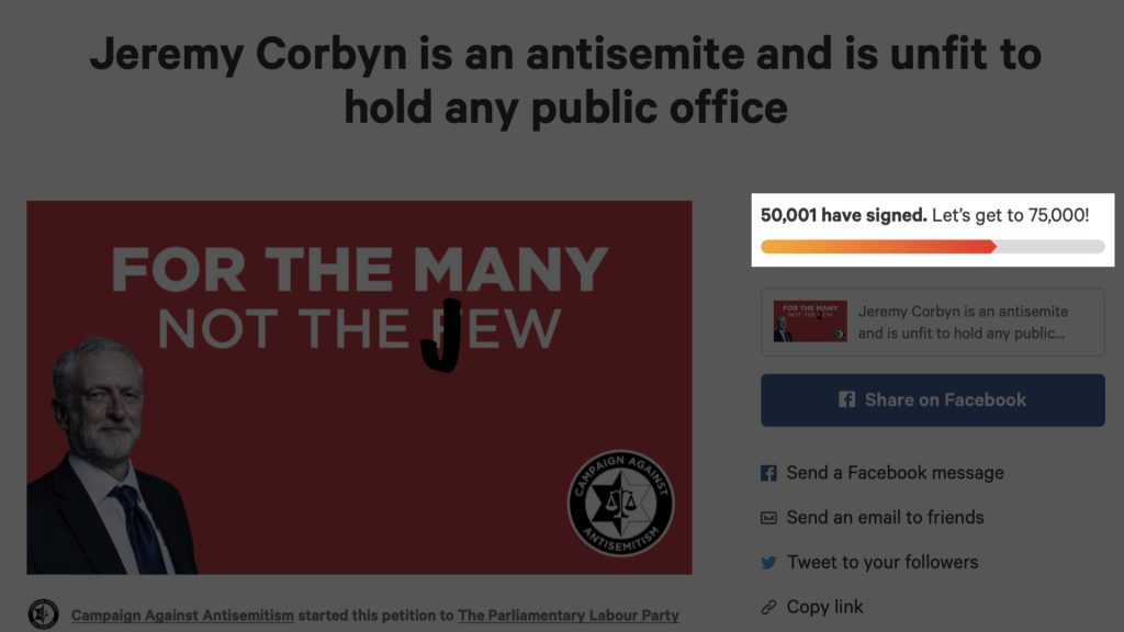 Campaign Against Antisemitism’s petition denouncing Jeremy Corbyn as an “antisemite” who is “unfit to hold any public office” has passed 50,000 signatures.