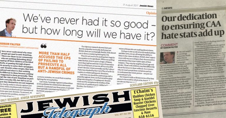 CAA Chairman writes in Jewish Chronicle, Jewish News and Jewish Telegraph explaining our Antisemitism Barometer research