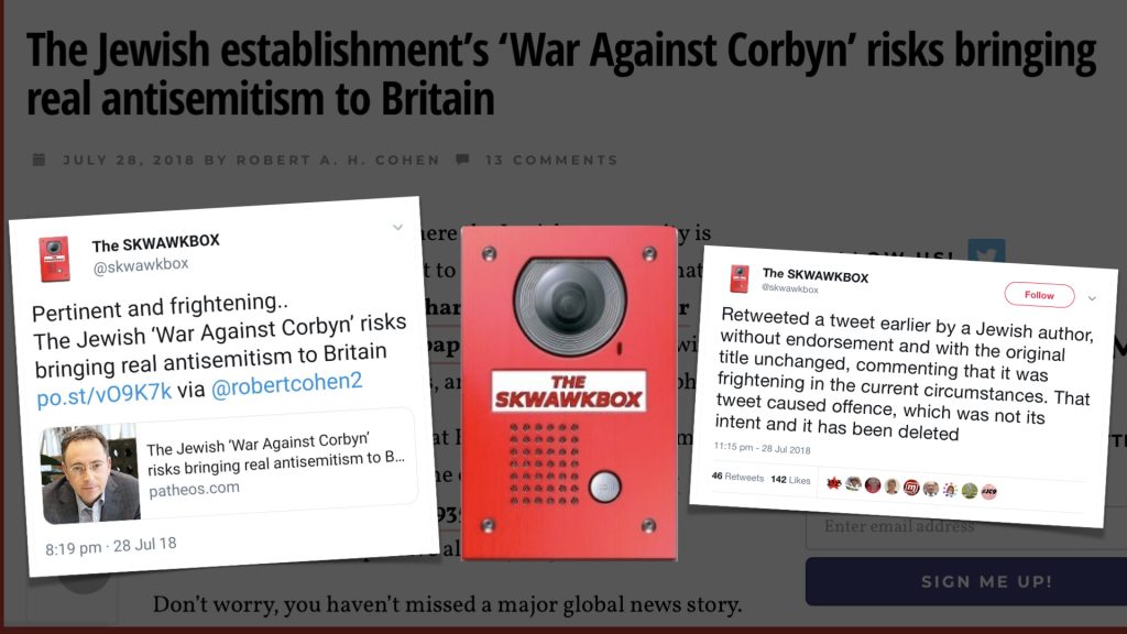 Rather than decrying this attempt to smear the Jewish community, Skwawkbox retweeted the article, calling it “Pertinent and frightening”. Skwawkbox later deleted the retweet, offering no apology, instead merely commenting: “Retweeted a tweet earlier by a Jewish author, without endorsement and with the original title unchanged, commenting that it was frightening in the current circumstances. That tweet caused offence, which was not its intent and it has been deleted”.