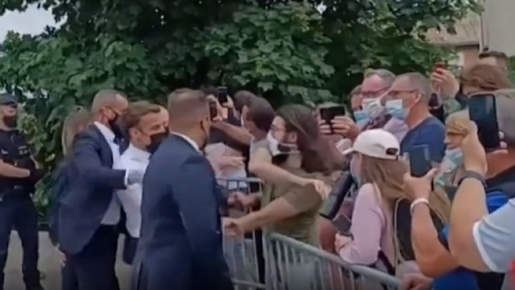 Whilst greeting a crowd in the French commune of Tain-l’Hermitage, President Macron shook the hands of a man who then slapped him across the face with his free hand.