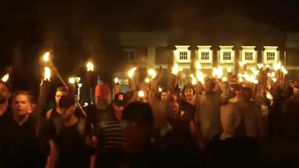 During the rally, held to oppose the planned removal of a statue of Confederate General Robert E. Lee, white supremacists marched through the town carrying torches and chanting “Jews will not replace us.”