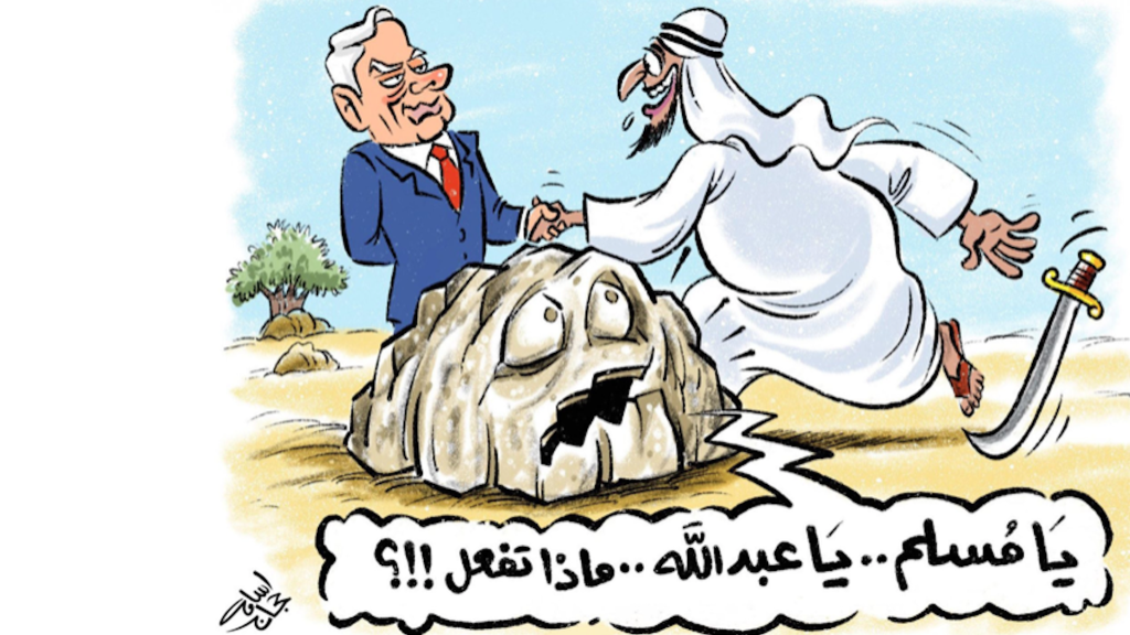 The Qatari-owned Al-Quds Al-‘Arabi newspaper, which is based in London, printed a cartoon in its 20th September edition showing figures that appear to be the Israeli Prime Minister, Benjamin Netanyahu, and an Emirati, the former standing behind a rock and the latter casting aside a sword.