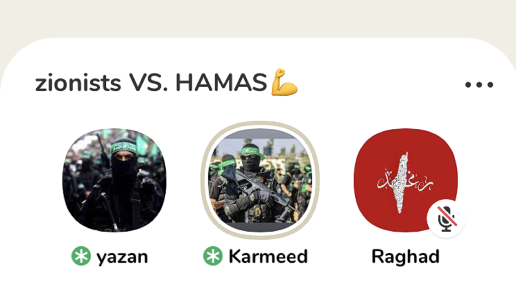 The room was shut down but a second was opened in its place, named “Zionists VS. HAMAS”, which not only featured users with Hamas profile photos but also one user with an image of a Jewish man beneath Hebrew text that called him a “dog” and a “whore.”
