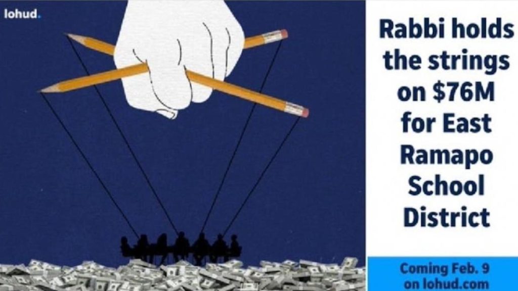 The Journal News in Rockland County, in the Lower Hudson area known locally as Lohud, ran the cartoon depicting a rabbi as a puppet-master manipulating children on top of a pile of cash. The words alongside read: “Rabbi holds the strings on $76m for East Ramapo School District.”