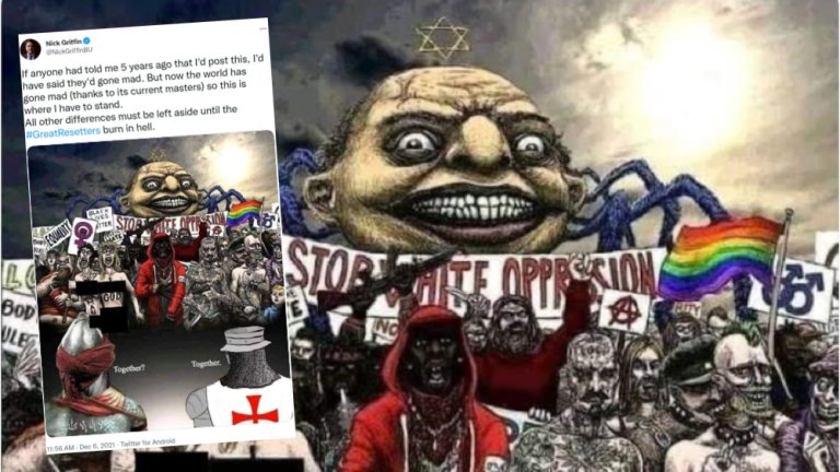 West Mercia police won’t investigate Nick Griffin over tweet showing grotesque Jewish spider urging forward horde of zombies to destroy civilisation as it is not “racially offensive language”