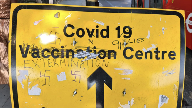 Vaccination centre sign vandalised with swastikas and the word “extermination”