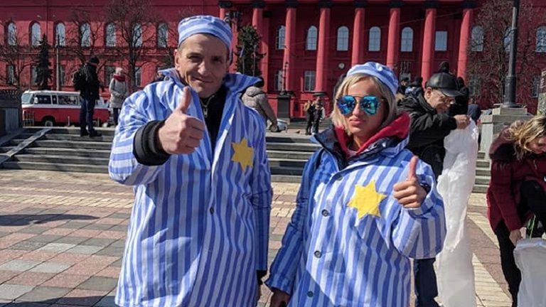 Anti-lockdown protestors in Ukraine don concentration camp uniforms