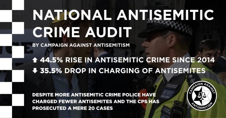 New report by CAA shows that antisemitic crime surged 44% in the last two years, but charging and prosecution dropped to only 20 prosecutions last year