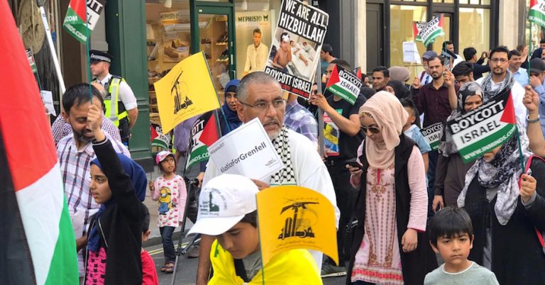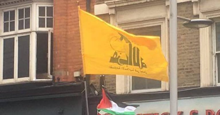 Demonstrators outside Israeli embassy in London fly Hizballah flag, snatch and burn Israeli flag, shouting “Allahu akbar”