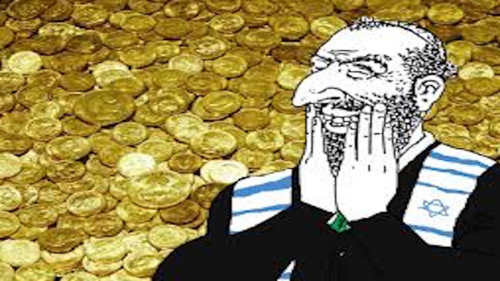 The image depicted a cartoon caricature of a man with a large hooked nose, wearing a Jewish skullcap or “kippah” and a prayer shawl or “tallit” bearing a blue Star of David. The caricature was set against a backdrop of gold coins, with the man smiling widely and his hands flat against his cheeks framing his open mouth. Antisemitic caricatures often portray Jews as having large noses and being obsessed with money.