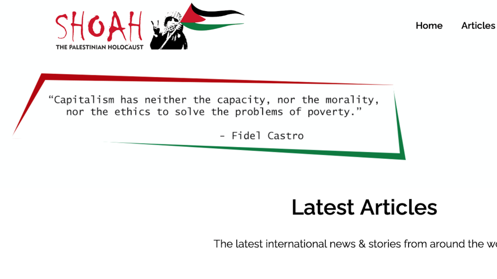 Shoah.org.uk, a website that launched in 2011 and joined Twitter earlier this year, says that its “aim is to give a voice to the millions of ordinary people around the word who want to end to the ‘Zio-Nazi’ oppression, environmental destruction of Palestine.”