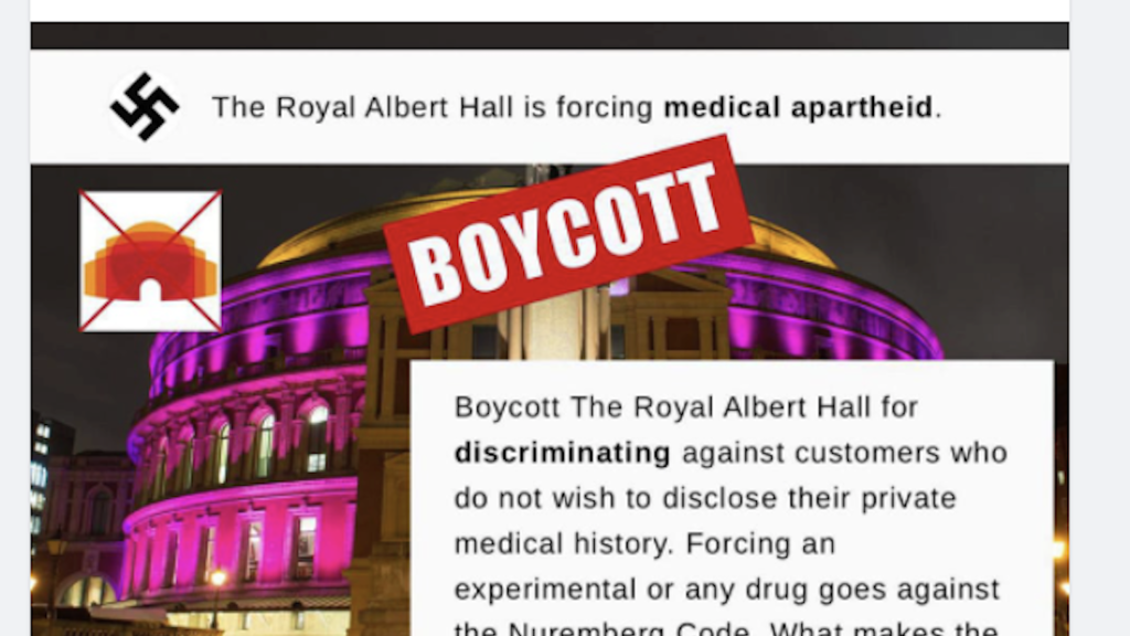 The image, posted to both his Facebook and Instagram, displays a swastika above a photograph of the Royal Albert Hall, accompanied by the words: “The Royal Albert Hall is forcing medical apartheid.”