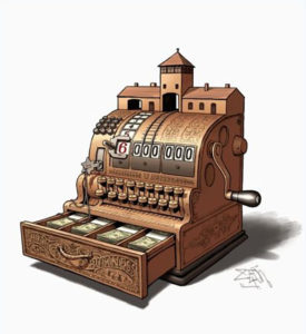 This image of the entrance to Auschwitz on top of a cash register promotes the libel, popular among antisemites, that Jews fabricated the Holocaust as a long-term means of generating money for themselves.