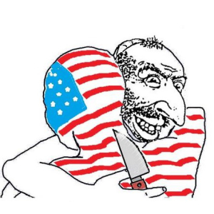 This grotesquely antisemitic caricature of a Jew embracing the USA while preparing to stab it in the back is both conspiracy theory and blood libel in one. It conveys the idea that Jews manipulate the American government, and are prepared to harm others to further their own ends.