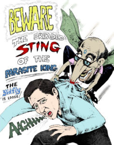 An antisemitic representation of a Jew as a vampire-like creature devouring other people, presumably non-Jews. The emblems used send the message that it is being done for the benefit of Israel and Freemasonry. Again, this is a combination of conspiracy theory and blood libel.