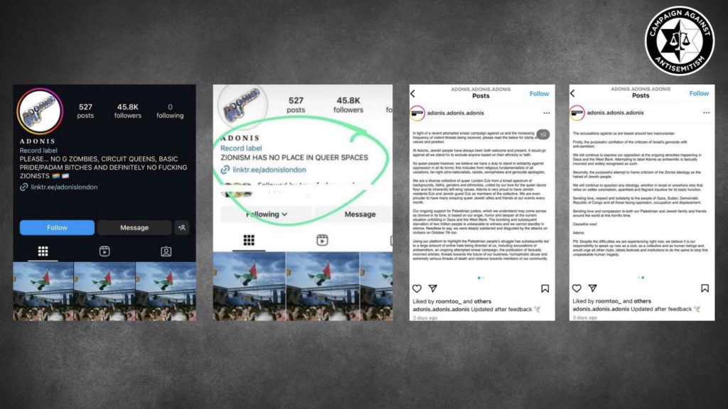 The LGBTQ+ nightclub Adonis announced in its Instagram bio that “definitely no f***ing Zionists” were welcome at its club nights. The promoters also claimed that “Zionism has no place in queer spaces”. After an outcry, the bio was amended to read “no genocidal maniacs plz xx.”