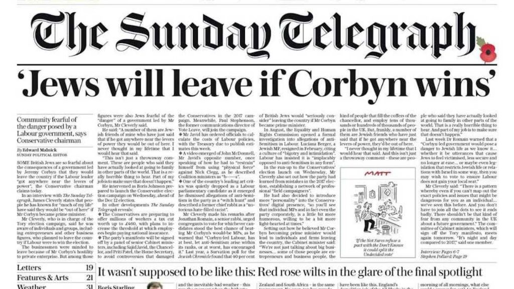 The Sunday Telegraph has run a front page story quoting James Cleverly, the Chairman of the Conservative Party, saying: “A number of Jewish friends of mine…have just said that if he [Labour leader Jeremy Corbyn] got anywhere near the levers of power they would be out of here. I never thought in my lifetime that I would hear that said.”