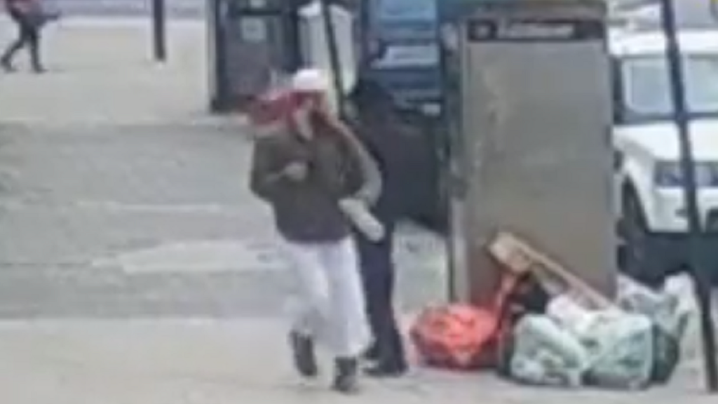 The suspect can be seen walking towards an Orthodox Jewish man and then striking him in the face with what appears to be a bottle.